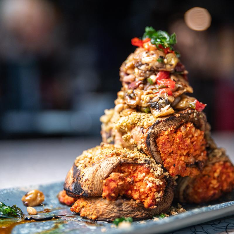 Red pepper romesco, caponata, herb bread crumbs, calabrian chilis, herb oil, balsamic.